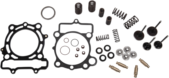 Caracteristicas: Kits contain all items to completely refresh and upgrade cylinder heads for popular Dirt/MX and Side x Side models Cylinder Head Service Kits include the below components: Lightweight Racing Valve Spring kits with steel or titanium retainers, beehive or dual valve springs, steel basewashers and Viton® valve stem seals A full set of C630 bronze high-performance valve guides for durability and heat management (standard size) A full top-end gasket kit including (base gasket, engine case gasket, exhaust gasket, head gasket, and other o-rings/washers depending on application)
