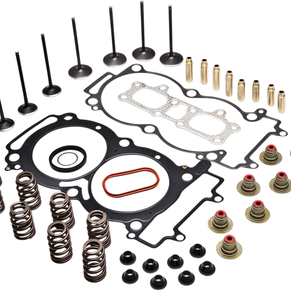 Caracteristicas: Kits contain all items to completely refresh and upgrade cylinder heads for popular Dirt/MX and Side x Side models Cylinder Head Service Kits include the below components: Lightweight Racing Valve Spring kits with steel or titanium retainers, beehive or dual valve springs, steel basewashers and Viton® valve stem seals A full set of C630 bronze high-performance valve guides for durability and heat management (standard size) A full top-end gasket kit including (base gasket, engine case gasket, exhaust gasket, head gasket, and other o-rings/washers depending on application)
