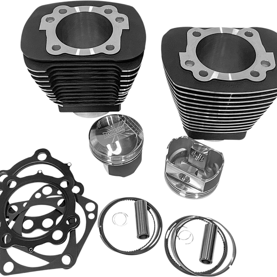 Caracteristicas: Revolution™ aerospace-grade all-aluminum cylinders with nickel-silicon-carbide electroplated bores, which means NO SLEEVING; allows larger bore sizes and less friction for more horsepower, lower temps, and a longer lifespan True bolt-on kit that delivers major power with no machine work required Also includes Wiseco forged pistons with rings (that are specifically designed for optimal compatibility with Revolution Performance's cylinders), wrist pins, circlips and high-performance head and base gaskets Replacement head and base gasket sets available separately Made in the U.S.A. For replacement pistons and rings, see Revolution Performance Big Bore Piston Kits.