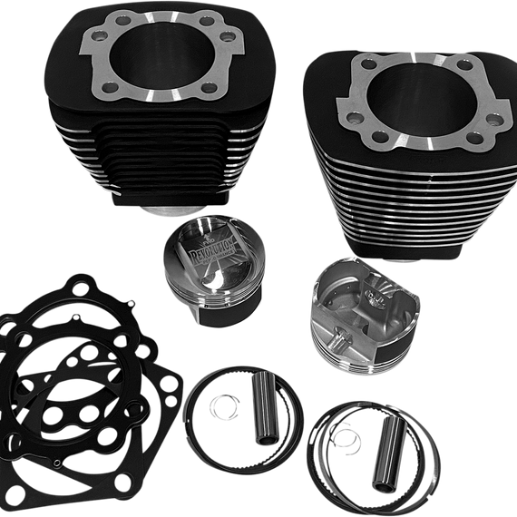 Caracteristicas: Revolution™ aerospace-grade all-aluminum cylinders with nickel-silicon-carbide electroplated bores, which means NO SLEEVING; allows larger bore sizes and less friction for more horsepower, lower temps, and a longer lifespan True bolt-on kit that delivers major power with no machine work required Also includes Wiseco forged pistons with rings (that are specifically designed for optimal compatibility with Revolution Performance's cylinders), wrist pins, circlips and high-performance head and base gaskets Replacement head and base gasket sets available separately Made in the U.S.A. For replacement pistons and rings, see Revolution Performance Big Bore Piston Kits.