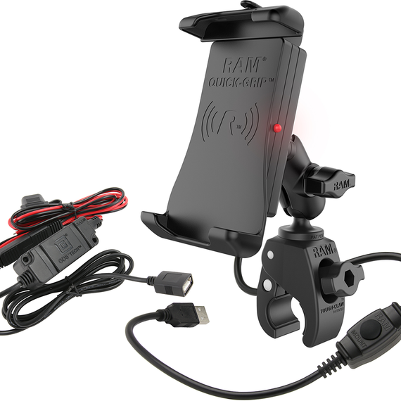 Caracteristicas: Powdercoated, marine-grade aluminum construction with stainless steel components and high-strength composite Universal, water-resistant wireless charging cradle features spring-loaded, RAM Quick-Grip™ design and 10W maximum output Includes a 1” B-size rubber ball with a diamond base, perfect for attaching any B-size RAM double-socket arms Connected Type-A male pigtail connector features an in-line switch that allows you to turn off the wireless charging module when not in use Compatible with handheld devices that will fit the following dimensions: minimum height of 5.625”, maximum height of 6.625”, maximum width of 3.125” and maximum depth of 0.7” Safety device tether included and recommended for outdoor applications