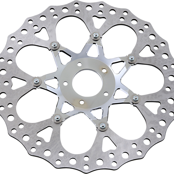 Caracteristicas: High performance floating brake rotors 420 stainless steel outer band cut and drilled for optimum performance and heat dispersion Inner carriers are CNC machined from aircraft quality billet aluminum