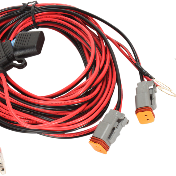 Caracteristicas: 14' wiring harnesses are designed to connect a pair of Dually or D2 LED lights to your 12V electrical system Feature battery terminals on one end and Deutsch connectors on the other to connect to the lights 18 AWG wire Incorporate an inline fuse holder, and a waterproof switch