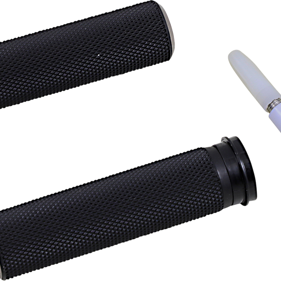 • Diamond Knurled rubber design features diamond knurled grips with integrated billet end caps for a clean design