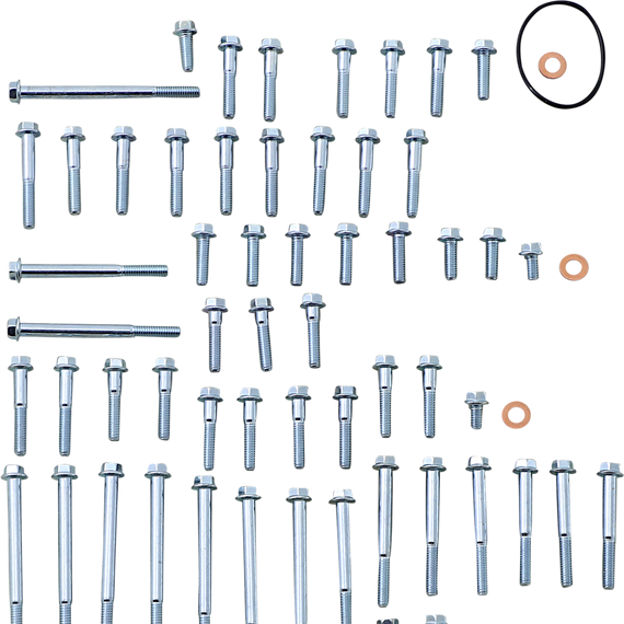 Caracteristicas: 4-Stroke kits fasten the crankcase, inner and outer clutch covers, water pump, left case cover, case saver, oil filter cover, cam tensioner, and starter 2-Stroke kits fasten the crankcase, inner and outer clutch covers, water pump, left case cover, case saver, reeds, cylinder, head, and power valve covers Includes all exterior fasteners for 2-stroke and 4-stroke engines Comes in easy-to-use, divided and labeled box