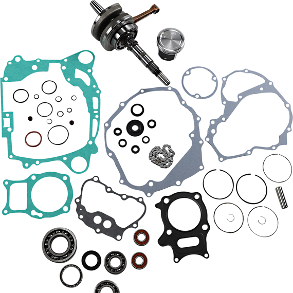 • Includes crankshaft, piston kit, complete engine gasket kit with oil seals, main bearings and seals, water pump rebuild kit, transmission bearings, countershaft bushing/seal kit, wrist pin bearing, cam chain and counter balancer bearings when applicable