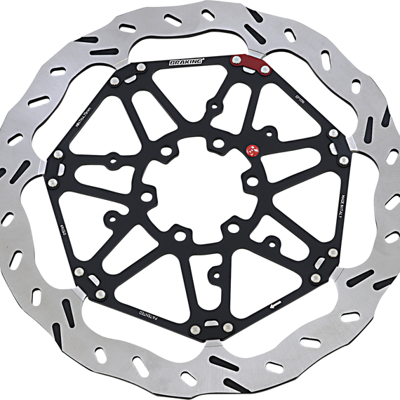 Caracteristicas: Designed with input from Braking's working experience with best teams in most important competitions in the world (SBK and SS) The braking track ensures a better heat dissipation, ensuring a steady friction coefficient The new connection structure allows a more controlled radial axial play, with a better load transfer between the braking track and the carrier Thermal design optimized Maximum weight-to-performance ratio Consistent disc temperature Absence of heat spots Direct load transfer between rotor and hub No pin deformation due to applied load