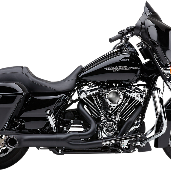 Caracteristicas: Designed to work with big wheeled Baggers with stretched bags It will work on conventional Baggers, though it may lessen ground clearance when leaned over 1-7/8" headpipes merged into a large 2.25" collector that steps up to a 2.5" perforated core Core is wrapped in a stainless-steel screen then enclosed in a fiberglass pillow Collector is covered with a large one-piece heat shield that is held in place with two clamps with the Cobra logo stamped on it Muffler body arrives pre-set in a slight upward position and can be rotated from there, allowing the rider to adjust the final position Works with both stock and extended bags