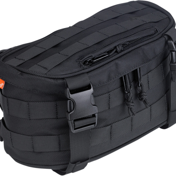 Caracteristicas: Features a coated, weather-resistant nylon packcloth exterior with heavy-duty polyester thread at all joints and seams Double-thick exterior walls and lid construction with internal padding for protection and durability Mil-spec orange interior panels on main and secondary compartments for enhanced material search and recovery inside the bag One-inch-wide nylon modified MOLLE system on perimeter panels and back for strap placement; includes four reinforced leather straps with nickel-plated buckles One main and two pocket compartments with YKK nylon zippers Cast alloy zipper pulls with polyester knotted rope extenders for easy operation with gloves Antique brass drain grommets on floor panel for moisture evacuation 1.25" wide cinch straps with heavy-duty nylon quick-release buckles help secure load after packing, to reduce movement and rattling Fully customizable for different applications and mounting locations including frame's down tubes, above the headlight, on tall and mid-sized handlebars and, of course, on both sides of sissy bars Dimensions are Main: 11" W x 5.75" H x 4.75" W; large pocket: 9.75" W x 5.75" D with 8" opening; small pocket: 5.75" W x 4.25" D with 4.5" opening