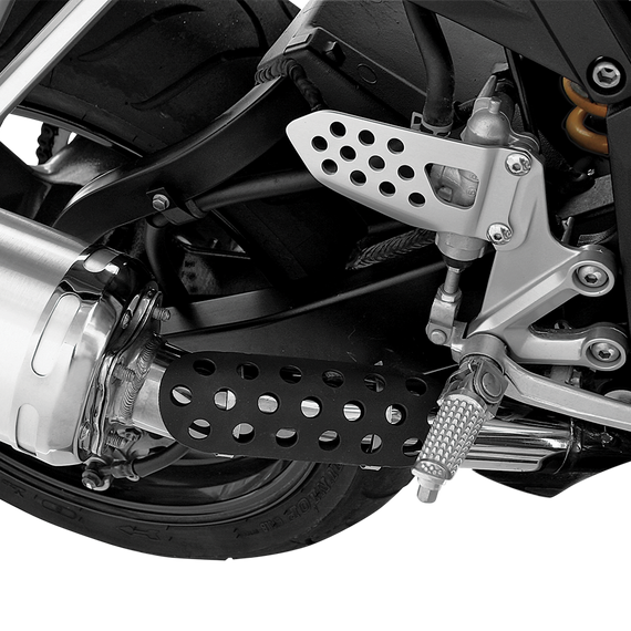 Caracteristicas: Protect boots from hot mid-pipes Constructed of anodized aluminum to add a high-performance trick look 7" long for excellent coverage Recessed edge lightening holes to eliminate sharp edges Eliminate scuff and burn marks on pipe Fit 2" - 2-5/8" mid-pipe diameter Exhaust clamps included; easy to install