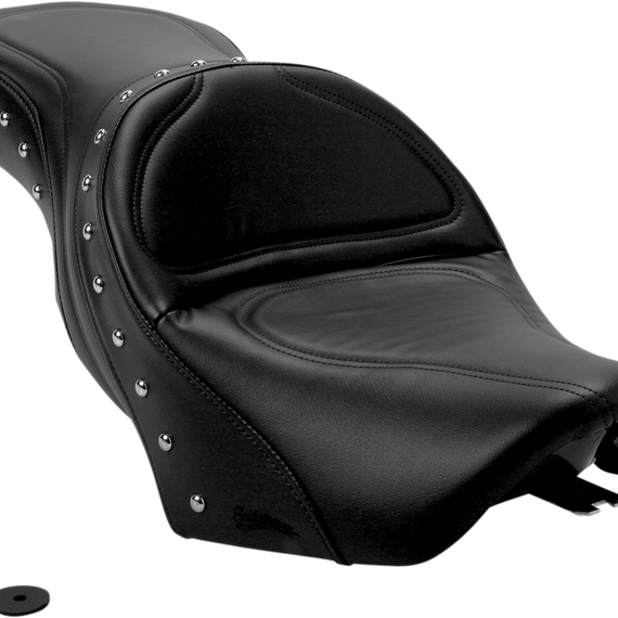 Caracteristicas: Designed and contoured for two-up touring comfort; match all studded saddlebags and luggage Split-cushion design separates seating surface from lumbar support, reducing tailbone and back pressure SaddleGel™ in both driver and passenger areas increases comfort during trips of any length Supple SaddleHyde™ offers a combination of comfort, glove-soft leathery feel and weather-resistant, no-maintenance good looks Also feature 1/2" chrome-plated brass studs that follow a special stitch pattern Made in the U.S.A.