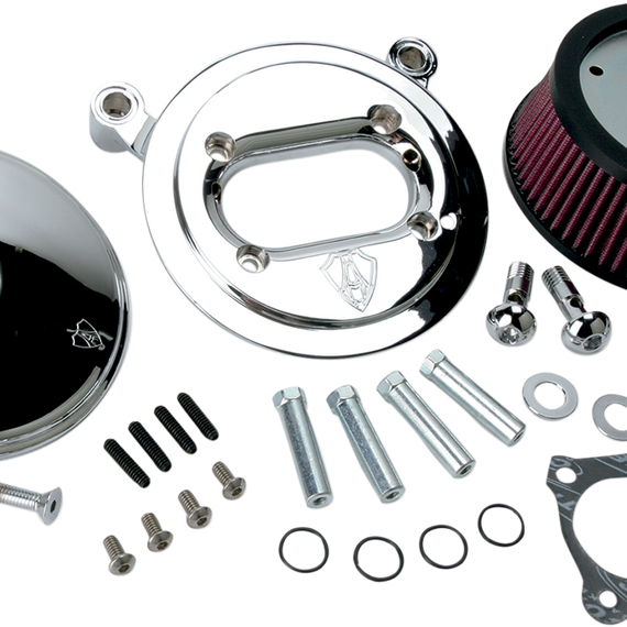 Caracteristicas: Features a one-piece aluminum backing plate/carb support bracket with patented hidden breather technology and radius air inlet Breather passages exit at the mouth of the carburetor/throttle body, creating a virtually closed-loop system Kit includes high-performance filter, backing plate and steel outer cover All necessary hardware and instructions are included with each kit