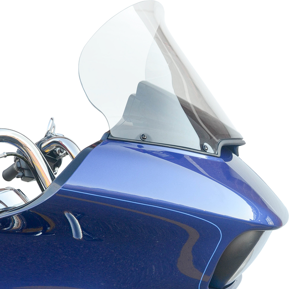 Caracteristicas: The Pro-Touring Flare™ is a wider, more full-coverage option for riders and passengers that prefer an even greater amount of wind protection for the long haul and is stylish enough to use around town The patented design features "hips" at the sides that re-route the wind away from riders while adding downforce to the front-end of the motorcycle to improve stability vs. riding with the stock windshield The flip at the top of the Flare™ redirects air back as clean, less turbulent air for rider and passenger Wind tunnel designed and tested Lexan® Polycarbonate with FMR hard coating is used to create these custom-molded designs with unmatched durability All are predrilled for easy mounting using stock windshield hardware Made in the U.S.A.