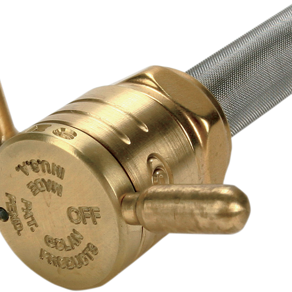 Caracteristicas: 90° movement between each detent ensures positive transition when riding Manufactured from 360 brass and stainless steel ball-bearings and components Features detents for quick, effortless switching from "On" to "Reserve" to "Off" Stainless steel internal ball bearings provide virtually friction-free petcock handle motion Valve position firmly held in place and unaffected by vibration Can be modified to fit custom tanks and/or be set to determine amount of reserve gas available with any custom gas tank Made in the U.S.A.
