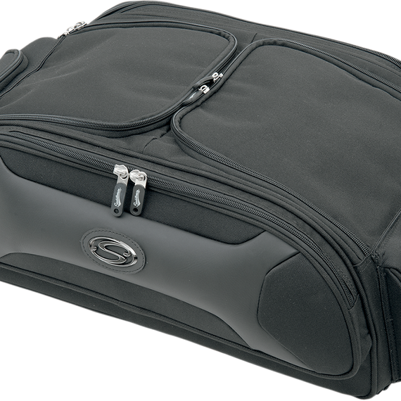 Caracteristicas: A sharp collection of motorcycle luggage from Saddlemen; the FTB line features a bold, yet sporty look with an array of vital features bundled with superb construction and class-leading value pricing This trunk and rack bag mounts in moments without fuss, using rugged nylon straps and clips attached directly to the body of the bag Brings never-before-seen style to the top of your touring bike’s trunk, trunk rack or large rear rack Semi-rigid walls, specially contoured for style and load capacity, hold their shape regardless of your cargo Gull-wing top flaps have perimeter zippers that open wide for easy loading and unpacking If the weather gets wet, use the supplied high-visibility, light-reflective rain cover to protect the bag and its contents FTB3300 dimensions: 22-1/2" W x 9" H x 12" D (bag excluding pockets) and 26" W x 9" H x 15" D (bag including pockets); capacity 10 lb.