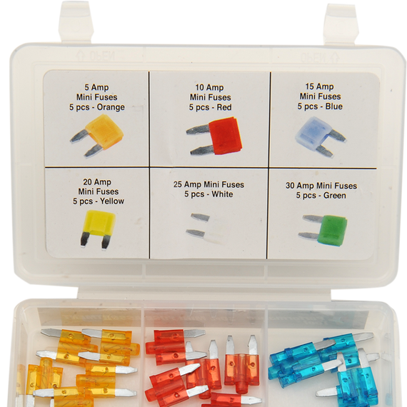 Caracteristicas: 33-piece master fuse assortment contains 5, 10, 20 and 30 amp standard (ATO) and mini fuses and 40, 50 and 60 amp maxi fuses 30-piece mini fuse assortment contains five each 5, 10, 15, 20, 25 and 30 amp mini fuses with LED indicator; LED lights up when fuse is bad Both assortments come in a convenient resealable plastic case