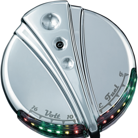 Caracteristicas: Stylish, sleek cap has two LED displays that show battery and fuel levels at a glance Fuel gauge illuminates a single green LED when full, from full to 5/8 tank a string of green LEDs, from 1/2 to 1/4 tank amber LEDs, from 1/4 red LEDs, and when near empty a flashing single red LED "Empty" fuel level at which the red LED begins flashing can be set by the rider Battery gauge shows green LEDs when the charging system is between 12.5V and 14.5V, amber LEDs if the bike is not charging and flashing red LEDs if charging level exceeds 15V or drops below 10V