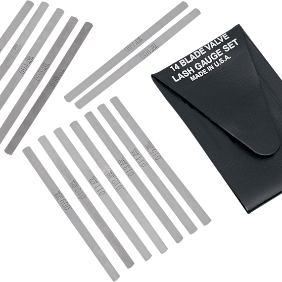 Caracteristicas: 14-pc. set of 4" x 1/4" feeler gauge blades, thickness .002" through .015" 1/4" wide gauge blades can be used to check valve clearances of small-diameter bucket and shim-type valve trains Blades are stored in a bi-fold pocketed vinyl pouch with a hook-and-loop closure Straight blades can be bent by the technician for custom applications Made in the U.S.A.