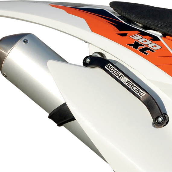 Caracteristicas: A place to grab for lifting your bike on a stand or out of the mud Made of 6061 T-6 aluminum Anodized black with laser-etched Moose Racing logo Attaches with longer bolts on silencer mounts through CNC-machined aluminum spacers Made in the U.S.A.