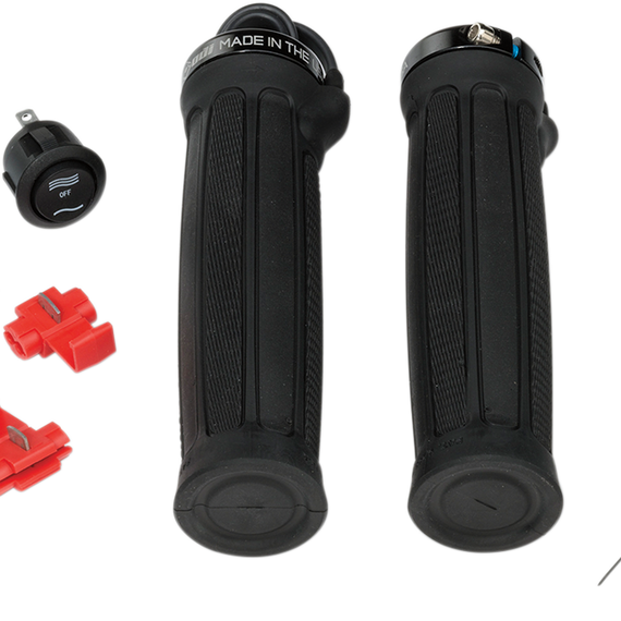 Caracteristicas: Two heated clamp-on grips fit most ATV models No adhesive required for installation Kit includes rubber grips, high/low round rocket switch, female spade connectors and cable tie Maximum 40 watts (20 watts per grip) at 14 volts Made in the U.S.A.