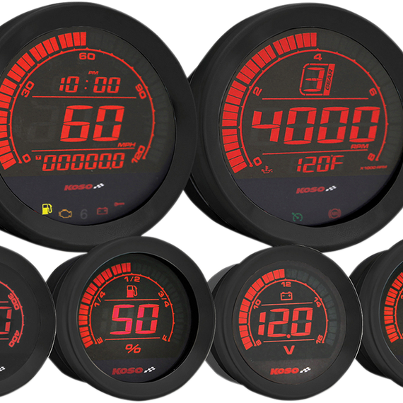 Caracteristicas: Plug & play Red and blue changeable LCD display 4" speedometer includes odometer, trip meter, and clock 4" tachometer also shows gear position, cruise control, and ABS functions 2" fuel meter shows percentage of fuel left 2" volt meter displays 8-16V DC Gauges can also be purchased individually