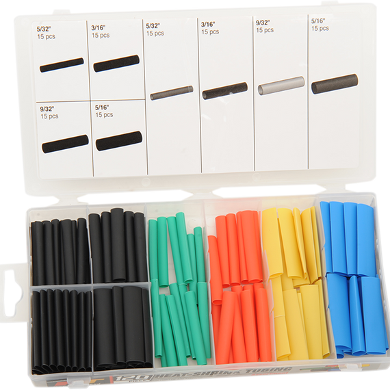 • Includes five colors of 5/32", 3/16", 9/32" and 5/16" diameter heat shrink