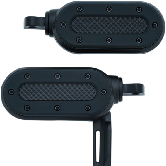Caracteristicas: Feature a flip-out arm that can be used as a heel rest Cast from quality A380 aluminum housings Knurled top surface area provides traction and control Premium EPDM rubber inserts reduce vibration Pegs without male-mount have splined ends and will not mount directly to H-D OEM footpeg mounts; these require Kuryakyn splined adapters PART #s 1620-0671, 1620-0851 or 1620-1316 for installation (sold separately)