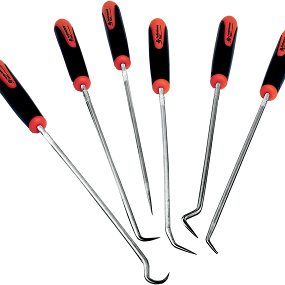 Caracteristicas: Durable double-injection-molded handles Includes straight, angled and combination picks Set contents: straight pick, 90° pick, double angle pick, complex pick, combination pick and hook pick Handy storage tray included