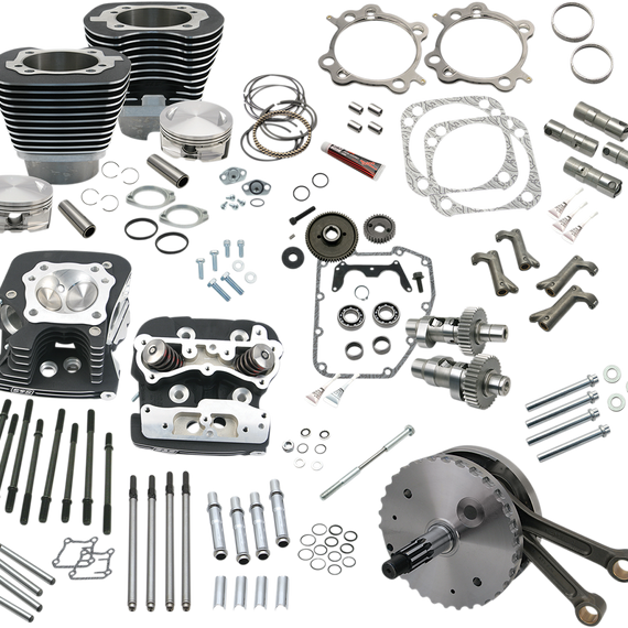 • Includes 4.125" bore cylinders and forged dished pistons, S&S 4.625" stroke flywheel assembly, S&S .640" lift chain-drive Easy Start cams, tappets, S&S Quickee adjustable pushrods, roller rocker arms, and all hardware, gaskets and instructions