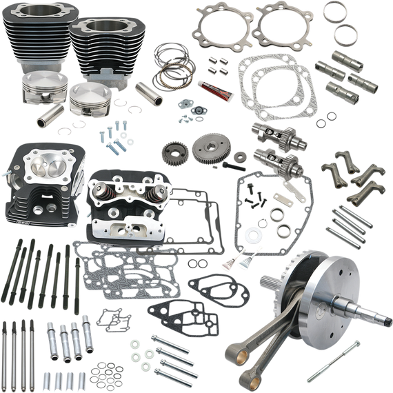 Caracteristicas: The S&S Hot Setup kit for Twin Cams allows a Twin Cam owner to convert a stock engine to 124" using the stock crankcases Includes 4.125" bore cylinders and forged dished pistons, S&S 4.625" stroke flywheel assembly, S&S .640" lift chain-drive Easy Start cams, tappets, S&S Quickee adjustable pushrods, roller rocker arms, and all hardware, gaskets and instructions Fuel system is not included Available in black powder-coat finish Made in the U.S.A. This project requires a skilled technician. It is the responsibility of the person assembling the parts to check all clearances and assembly specifications.