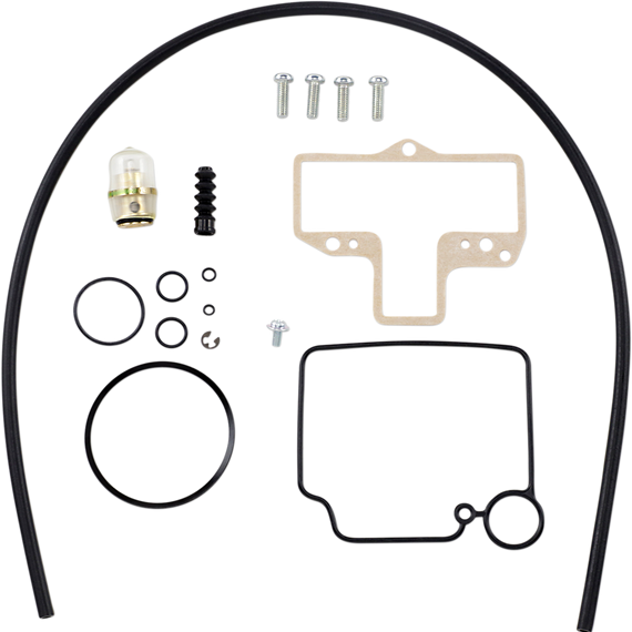 • Include top cover gasket, jet needle E-ring and washer, throttle valve seal, pilot air O-ring, fuel joint O-ring, accelerator pump O-ring, needle valve O-ring, needle valve retainer screw, needle valve assembly, float bowl O-ring/gasket, overflow hose, float bowl screws, accelerator pump rod boot