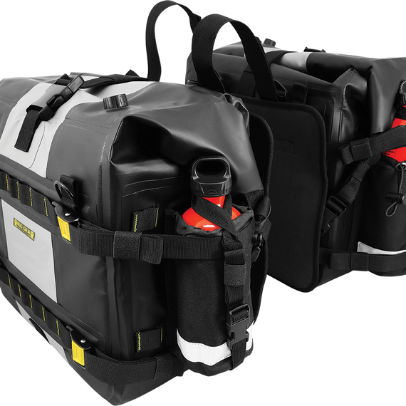 Caracteristicas: 100% Waterproof saddlebags Durable and waterproof PVC Tarpaulin Electronically heat welded seams Watertight roll closure with quick release buckles UV coated outer material cleans easily and prevents slipping or marking Mounts using patented RIGG STRAP® system Removable stiffener allows bag to hold its shape when empty Side bottle pocket large enough to hold 30 ounce bottles (bottles not included) Side MOLLE panel to add optional accessories Each side is collapsible with compression straps for smaller loads Firm internal back plate helps support bag Replaceable back pad helps protect bags from contact with rack Metal D-rings can be used to mount dry roll bag on top Purge valve makes for compression easy Reflective accents for visibility Includes two lightweight saddlebag liners to easily pack contents and remove Easily mounts to most motorcycles with racks Holds approximately 28 liters per side