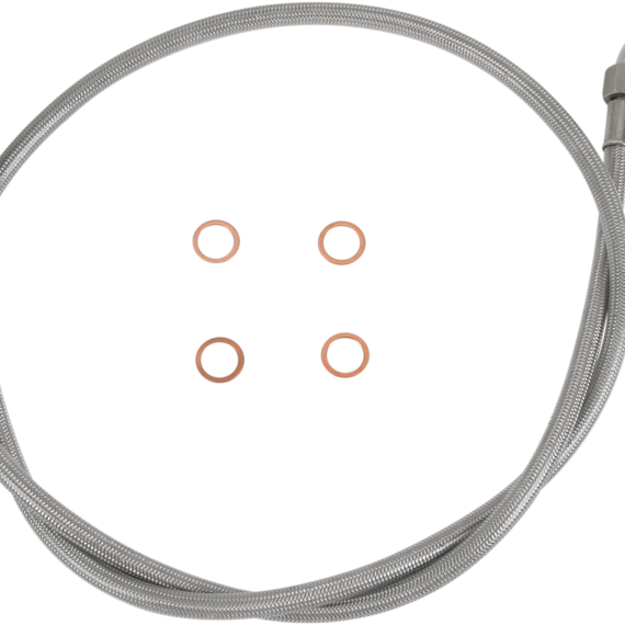 Caracteristicas: Swivel union ends are the secret to easier fitting, and ensure a kink- and stress-free installation Venhill Engineering in the UK makes Moose Racing Stainless Steel Brake and Clutch lines to the highest specifications Each line is made from top quality DuPont Teflon®-coated hose, wrapped with British-made stainless steel, and PVC-coated for protection and great looks Rubber protection boots and extra-rigid tubing are used to protect vulnerable areas from heat and impact and to prevent hose flex under compression Each line is designed to withstand a minimum of 14,000 psi Installing Moose Racing stainless lines gives a large performance increase by significantly reducing expansion under pressure and absorption of water when compared to stock rubber hoses