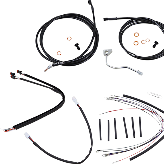Caracteristicas: Complete installation kit for Burly Ape hangers Kits include extended brake line (unless noted), extended clutch cable/clutch line, extended throttle/idle cables as required and all necessary wiring Brake lines, when included, feature PTFE inner liner and heavy-duty stainless steel outer braid Dresser kits reuse stock Throttle-By-Wire harness Kits are based on using 2" risers with ape hanger-style handlebars
