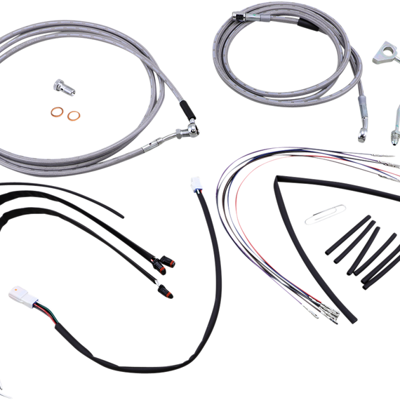 Caracteristicas: Complete installation kit for Burly Ape hangers Kits include extended brake line, extended clutch cable/clutch line, extended throttle/idle cables as required and all necessary wiring Brake lines feature PTFE inner liner and heavy-duty stainless steel outer braid Dresser kits reuse stock Throttle-By-Wire harness Kits are based on using 2" risers with ape hanger-style handlebars