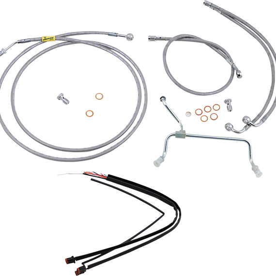 Caracteristicas: Complete installation kit for Burly Ape hangers Kits include extended brake line, extended clutch cable/clutch line, extended throttle/idle cables as required and all necessary wiring Brake lines feature PTFE inner liner and heavy-duty stainless steel outer braid Dresser kits reuse stock Throttle-By-Wire harness Kits are based on using 2" risers with ape hanger-style handlebars