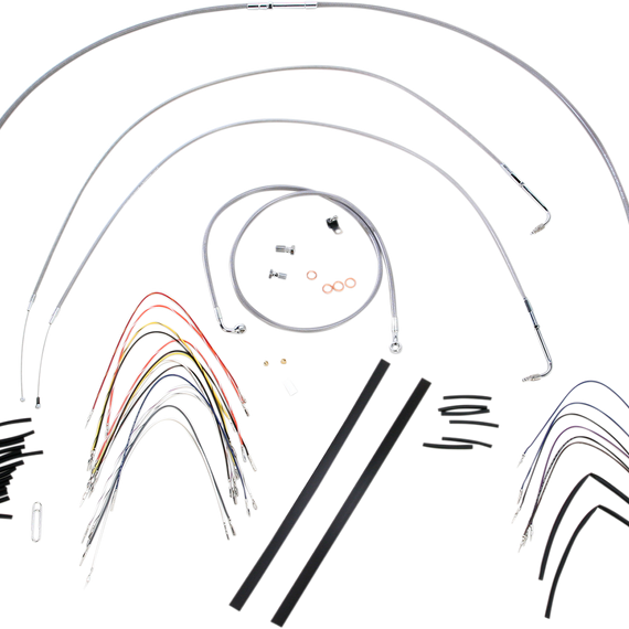 Caracteristicas: Complete installation kit for Burly Ape hangers Kits include extended brake line, extended clutch cable/clutch line, extended throttle/idle cables as required and all necessary wiring Brake lines feature PTFE inner liner and heavy-duty stainless steel outer braid Dresser kits reuse stock Throttle-By-Wire harness Kits are based on using 2" risers with ape hanger-style handlebars