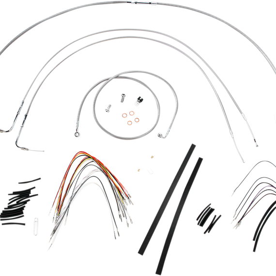 Caracteristicas: Complete installation kit for Burly Ape hangers Kits include extended brake line, extended clutch cable/clutch line, extended throttle/idle cables as required and all necessary wiring Brake lines feature PTFE inner liner and heavy-duty stainless steel outer braid Dresser kits reuse stock Throttle-By-Wire harness Kits are based on using 2" risers with ape hanger-style handlebars