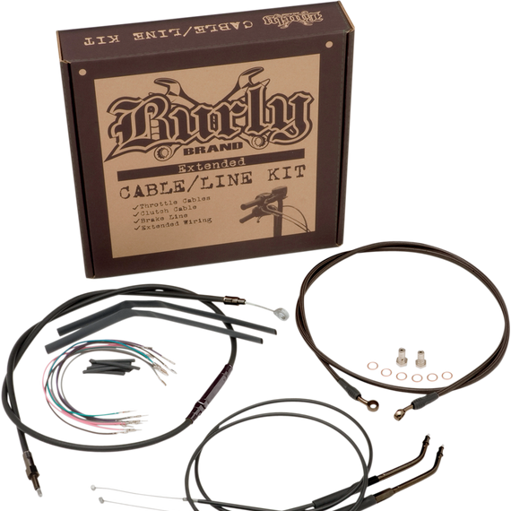 Caracteristicas: Complete installation kit for Burly Ape hangers Kits include extended brake line, extended clutch cable/clutch line, extended throttle/idle cables as required and all necessary wiring Brake lines feature PTFE inner liner and heavy-duty stainless steel outer braid Dresser kits reuse stock Throttle-By-Wire harness Kits are based on using 2" risers with ape hanger-style handlebars