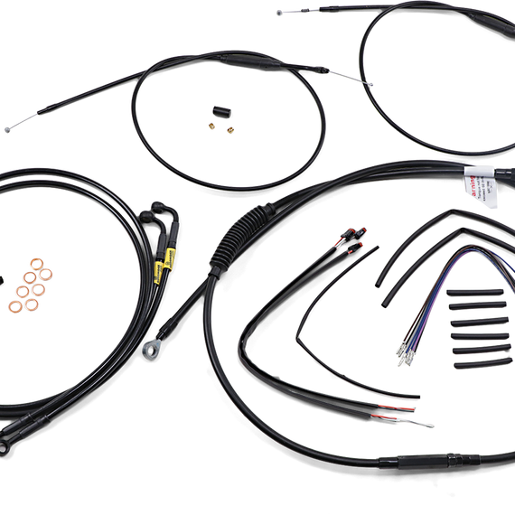 Caracteristicas: Complete installation kit for Burly Ape hangers Kits include extended brake line (unless noted), extended clutch cable/clutch line, extended throttle/idle cables as required and all necessary wiring Brake lines, when included, feature PTFE inner liner and heavy-duty stainless steel outer braid Dresser kits reuse stock Throttle-By-Wire harness Kits are based on using 2" risers with ape hanger-style handlebars