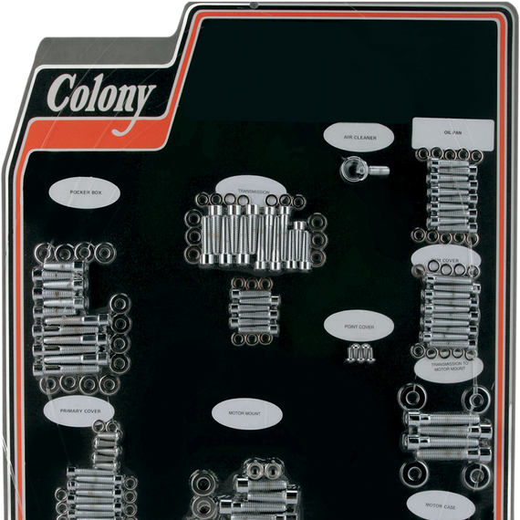 Caracteristicas: High-quality chrome-plated finish Kits include everything you need to mount rocker boxes, primary cover, lifter base, transmission covers, oil pump, air cleaner, cam cover, point cover timing plugs and motor mounts Fasteners for motor case and oil hose cover are also included Made in the U.S.A.