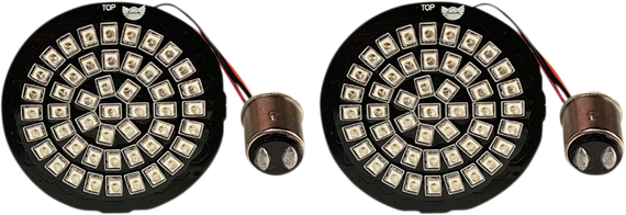 Caracteristicas: 48 super bright red LEDs per unit, providing a brighter light output and wider viewing angle than even the original Genesis® LED turn signal inserts The outer ring of 24 red LEDs illuminates in a red halo ring that functions as the running light while 24 center red LEDs provide a full-contrast brake and turn signal light for maximum visibility 1157 pigtail bulb base for plug and play rear turn signal applications DOT Compliant when used behind Custom Dynamics® red, smoked or clear ProBEAM® motorcycle turn signal lens (sold separately)