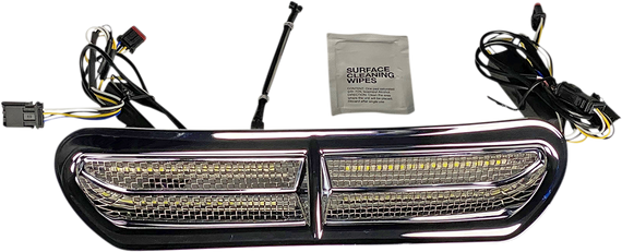 Caracteristicas: Replaces the factory batwing fairing vent 15 super bright white LED running lights and 15 amber LED turn signals Stainless steel mesh matches look of stock air cleaner Allows stock fairing vent to open and close Plug and Play