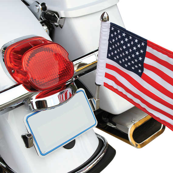 Caracteristicas: Fit most license plates (2-3/4" between mounting holes) (will not fit MN, NY, or AK) Can be mounted on either side All stainless steel Come with flag, pole and mounting hardware Other flags also available; sold separately Made in the U.S.A.