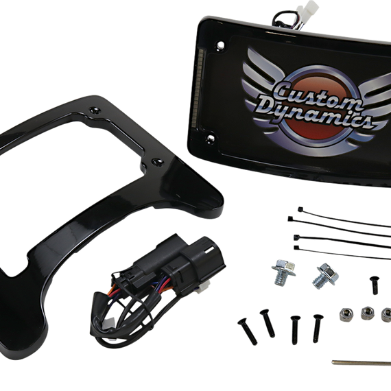 Caracteristicas: Light-weight aluminum radius license plate mount adds a custom look to the rear fender by eliminating the stock rear turn signal bar 20 dual-intensity re LEDs ar flush mounted on either side providing rear facing running lights 6 white LEDs for plate illumination Replaces OEM rear turnsignal bar Utilizes stock bolt holes for mounting Mounting hardware included Plug and play installation