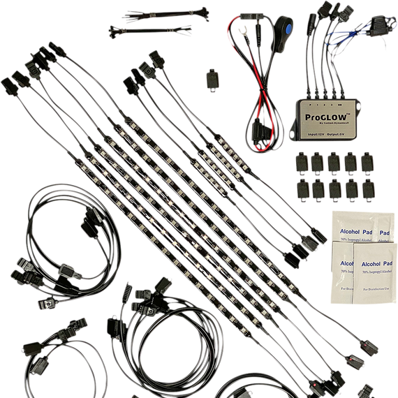 Caracteristicas: Covers engine, ground effects and saddlebags The innovative app connects to IOS or Android providing Bluetooth control of your lights at your fingertips Kit includes 6 ProGLOW™ 15 LED Strips and 4 ProGLOW™ 6 LED Strips Kit includes complete installation supplies, wire splitters, extensions and end caps Required ProGLOW™ 5V Bluetooth Controller is included