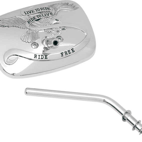 Caracteristicas: High-quality die-cast mirrors feature "Live to Ride...Ride Free" script Allen wrench for setscrew, chromed acorn nut and necessary mounting hardware included Mirror face measures approximately 5" x 3-3/4"