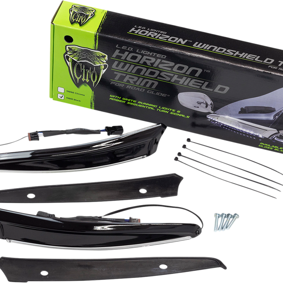 Caracteristicas: Adds bright white LED running lights and amber sequential turn signals to the front of your bike in the cleanest way possible The LEDs and hardware are both hidden behind a masterfully designed chrome or black steel trim piece that complements the styling of your Road Glide Durable steel construction with shatterproof lens Rubber gasket protects painted surfaces Plug and play wiring adapter included Bright white running lights Sequential amber turn signals Works with aftermarket windshields Hidden hardware for a clean look