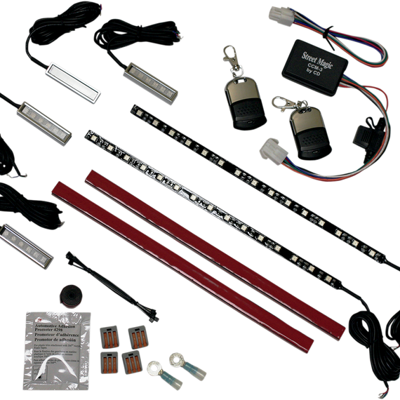 Caracteristicas: Six 15-LED Magical Wizard™ flexible strips Lights up engine, rear wheel and ground effects Four flexible mounting sticks Four color-changing standard Magical Wizard™ Pods Two individual key fobs LeverLockz™ installation kit with instructions Bluetooth wireless 4.0 compatible remote works with Android & IOS applications Not for V-ROD models.