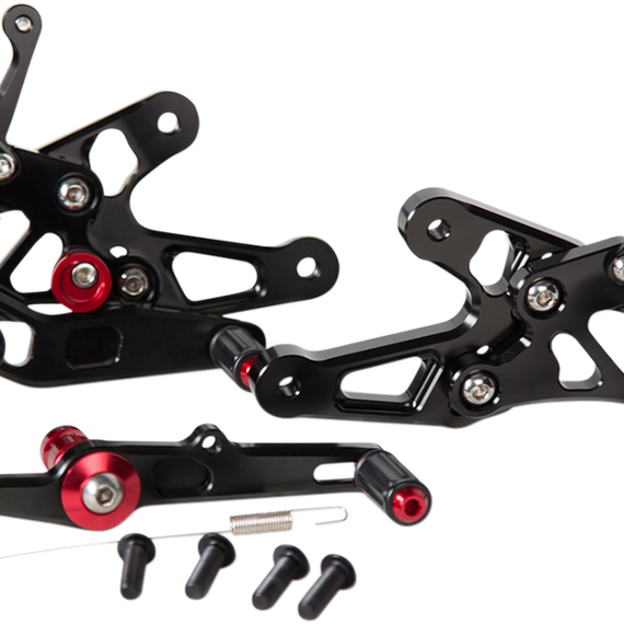 Caracteristicas: CNC machined from aircraft grade T6 6061 billet aluminum Fully adjustable to suit your riding style Mounting bracket and brake light switch spring included Supports OEM brake light switch Fully assembled and easy to install Knurled foot pegs with plastic caps Most applications can be converted to GP shift Complete kit - no additional parts required Ships fully assembled